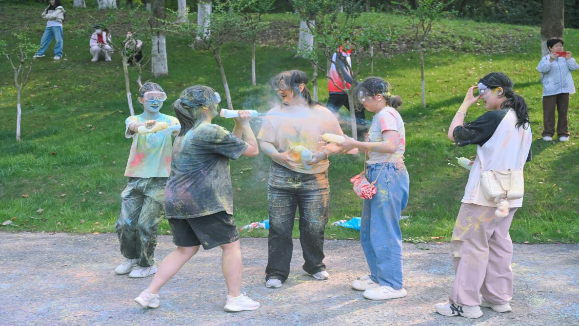 令人激动的是,现场还设置了"彩虹跑"环节。参与者们在五彩斑斓的色粉中尽情奔跑,仿佛置身于一个充满活力的色彩世界。阳光透过绿树的枝叶洒下,为这场活动增添了一份青春的气息,每一张照片都定格了这份活力与美好。