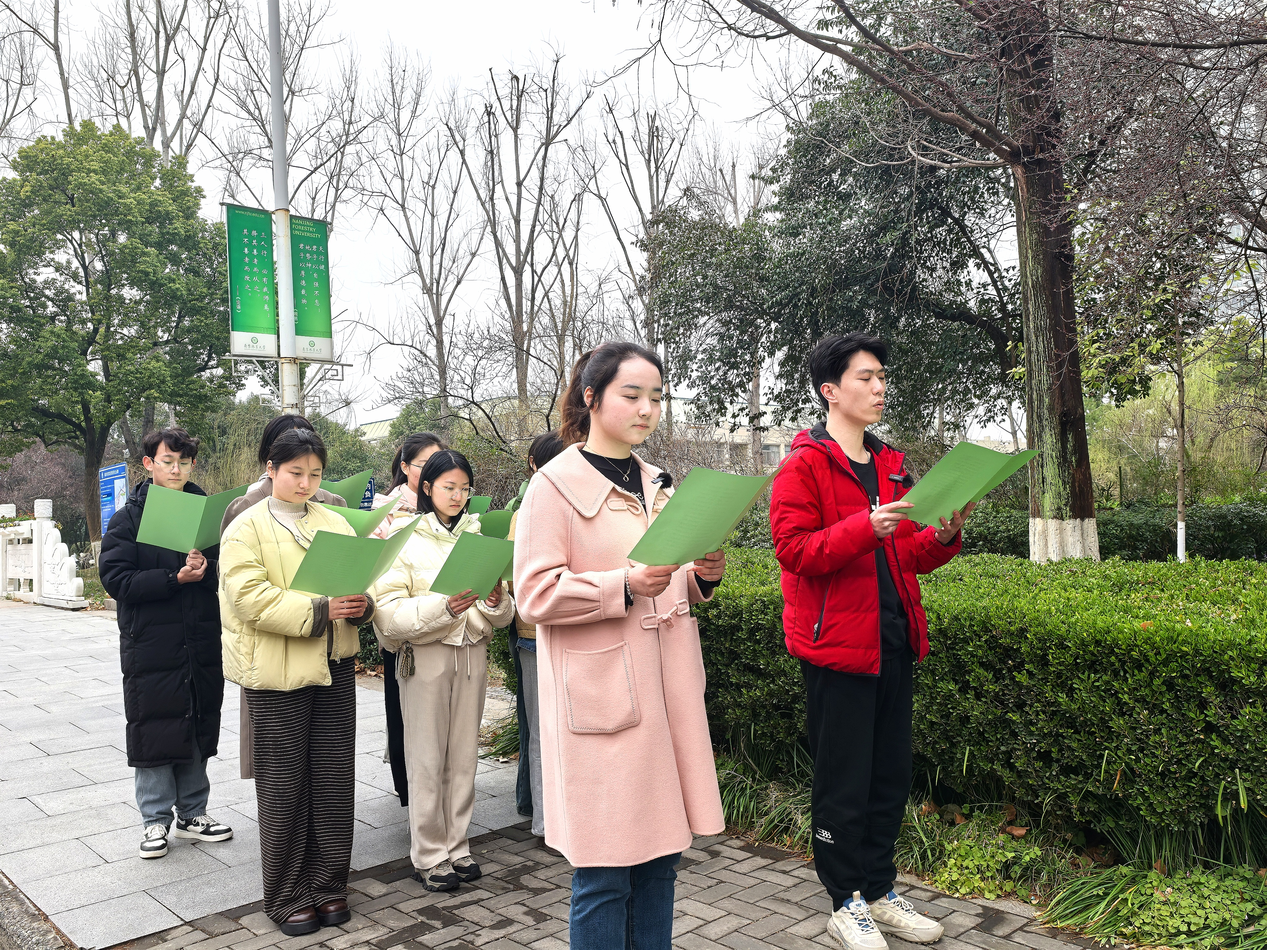 "化石龙骸夸禄丰,水杉并世争长雄。禄丰龙已成陈迹,水杉今日犹葱茏……"清晨,阵阵吟诵声在校园二道桥畔泛起涟漪。二道桥两旁的四株水杉树是由郑万钧先生于1956年亲手栽植,学院"碧水青山"传习社的社员们矗立在水杉树旁、直播镜头前,高声朗诵《水杉歌》、深情讲述郑万钧先生与水杉的故事,带领观众穿越时空,重温南林人发现并保护"活化石"的科研壮举。树干上斑驳的年轮是漫长岁月镌刻下的自然印记,诉说林业科技工作者们"把论文写在祖国大地上"的艰辛耕耘和高尚信仰。