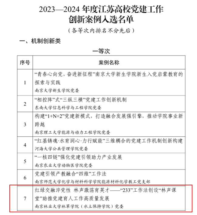 2025年9月1日,中共江苏省委教育工委印发《省委教育工委关于公布 2023—2024 年度江苏高校党建工作创新案例名单的通知》(苏委教组函〔2025〕39 号),21点基本策略 林草21点基本策略 (水土保持21点基本策略 )党委申报的 "红绿交融淬党性 林声激荡育英才 ——‘233’工作法创设‘林声课堂’助推党建育人工作高质量发展,经申报、推荐、评选、专题研究等环节,成功入选 2023—2024 年度江苏高校党建工作创新案例(机制创新类)一等次。