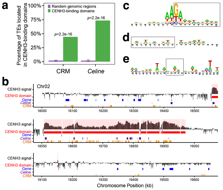 我们发现Celine优先定位于杨树每染色体的功能着丝粒区域84%的Celine位于CENH3结合域,而在毛果杨中,只有51%的CRM与CENH3结构域结合。这表明CelineCRM采用了不同的着丝粒靶向机制,发现亲缘关系很远的Camellia sinensisFraxinus pennsylvanica部分染色体着丝粒区域也有Celine的分布证明了Celine的着丝粒靶向特性是原始的,并且在远缘植物物种中保守
