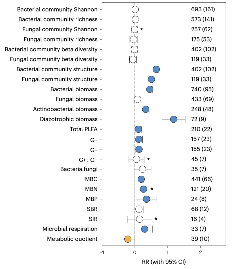 微生物接种是指在植物或土壤中引入有益微生物,作为传统农用化学品的可持续替代品。这种方法在农业和生态恢复领域的应用越来越广泛。以往的研究已经证明,在全球范围内,微生物接种剂可以改变本土微生物群落结构,但对其在全球尺度上对本土微生物生物量和多样性影响的研究仍然不足。微生物入侵的成功还取决于资源的可用性,但我们仍不清楚初始土壤资源条件是否会调节微生物接种剂的影响。此外,故意引入微生物接种剂会影响土壤中的微生物类群和结构,单个物种丰度的变化可能显著影响整个微生物网络。特别是,关键类群对维持网络结构和功能至关重要。如果这些关键类群受到微生物接种剂的影响,整个群落的生物相互作用和环境条件可能会被重塑,从而可能导致网络解体。然而,微生物接种剂对土壤微生物网络的综合影响仍不清楚。