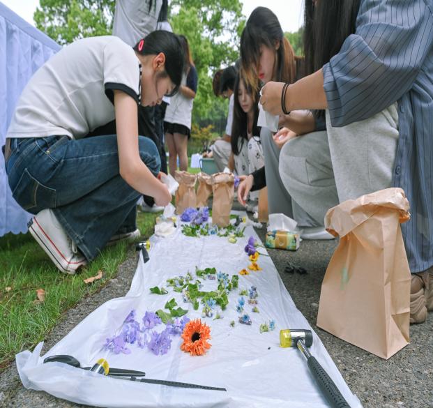 活动现场欢声笑语不断,孩子们在志愿者的指导下,将采集的树叶和花瓣精心排列,用小锤轻轻敲打,把自然的色彩和形状永久保留在布料上。另一边,创意树叶画区域里,小朋友们发挥天马行空的想象力,用不同形状的叶片拼贴出各种生动有趣的图案。志愿者们耐心讲解植物知识,让小朋友们在动手实践中感受大自然的奇妙。阳光透过树梢洒在草地上,斑驳的光影与孩子们的笑脸相映成趣,构成了一幅充满生机与活力的春日画卷。