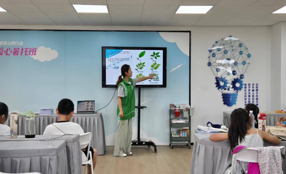 相互认识之后,志愿者们紧接着开展了"叶片知识课堂"。借助PPT,他们生动地向孩子们科普了叶片的基本结构、不同类型叶片的特点以及叶片在植物生长过程中的重要作用。孩子们在各位哥哥姐姐的带领下,积极思考,踊跃回答问题,课堂气氛十分活跃。
