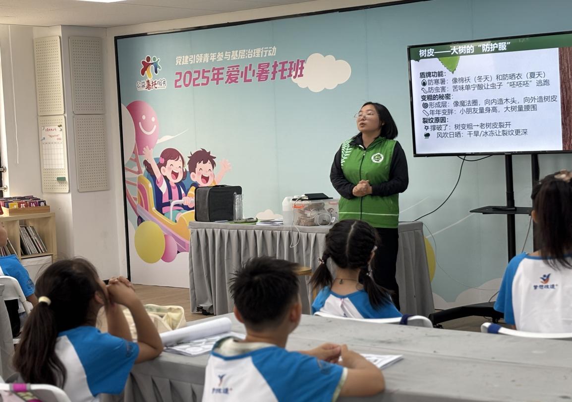 次日上午,志愿者韩丰娇为小朋友们开展了一堂别开生面的"树干科学课"。在课堂上,借助丰富多样的图文资料、生动有趣的视频等多种形式,深入浅出地向孩子们讲解了关于树干的诸多知识。其中涵盖了树干各个组成部分的详细内容,详尽阐述了树干的生长过程,从幼小的树苗逐渐长成粗壮树木的过程中,树干是如何一点点发生变化的。并且着重强调了树干对于植物自身所起到的关键的支撑和运输作用,正是树干的支撑,植物才能挺立于天地间,也是树干内部的运输通道,将根部吸收的水分和无机盐输送到植物的各个部分,再将叶片光合作用产生的有机物运送到植物全身。在这个过程中,孩子们全神贯注,充满了求知欲。