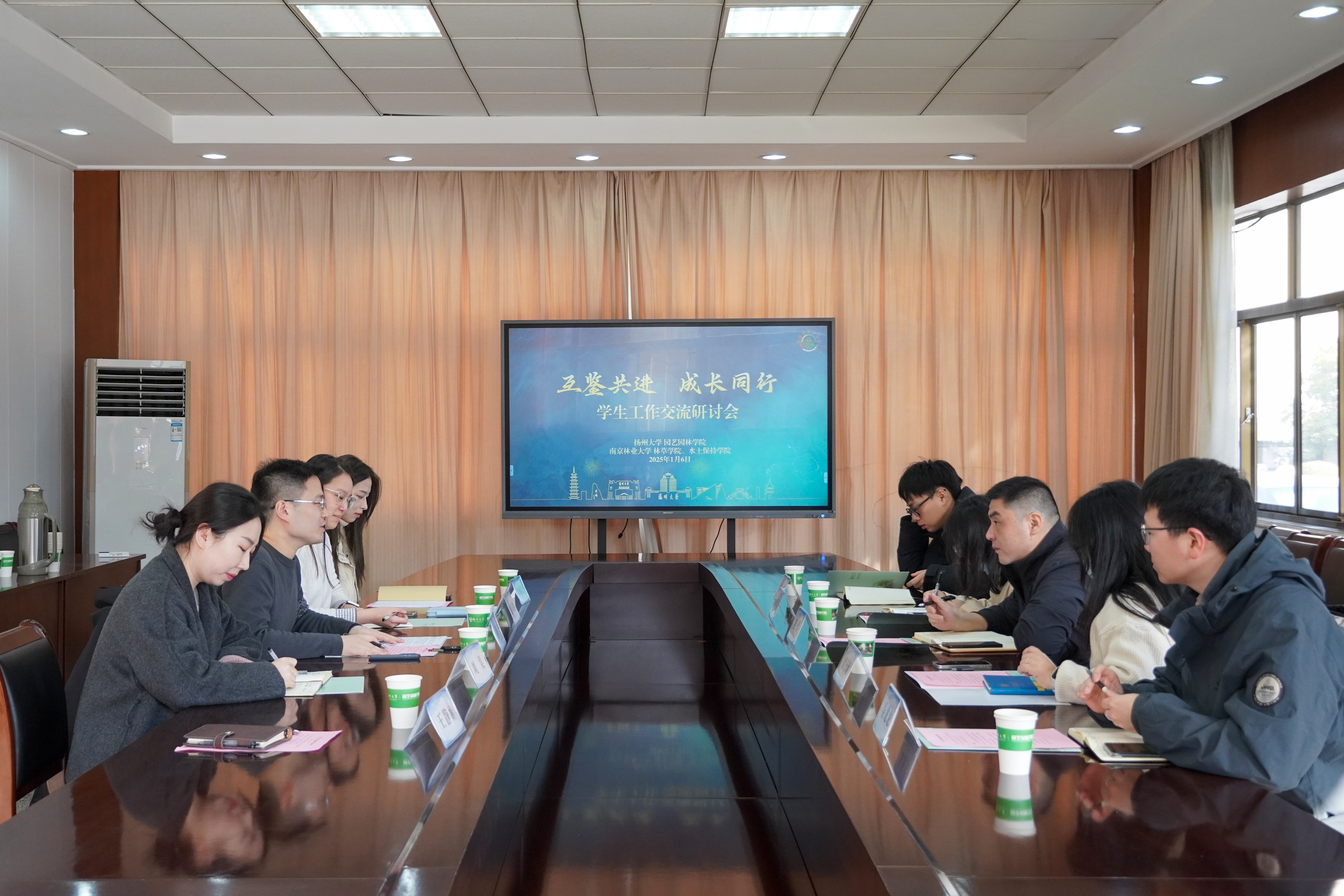 双方就各自21点基本策略 开展的特色工作进行了介绍和分享。并就学生党员发展、学生干部队伍建设、学生就业、创新创业和挑战杯项目孵化及培育等方面展开了深入的探讨和交流。针对新形势下学生工作中的难点和痛点,双方学工人员深度剖析、互相借鉴,共同商讨应对的方案和对策。